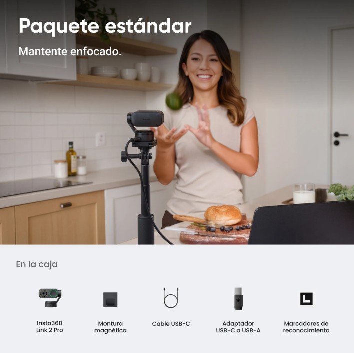 La Insta360 Link 2 Pro es una webcam profesional en resolución 4K que incorpora inteligencia artificial y un gimbal integrado para seguimiento automático. Ofrece imagen de alta calidad incluso en baja luz, encuadre inteligente, audio con cancelación de ruido y múltiples modos de uso, siendo ideal para videollamadas, streaming, clases online y creación de contenido con acabado profesional.
